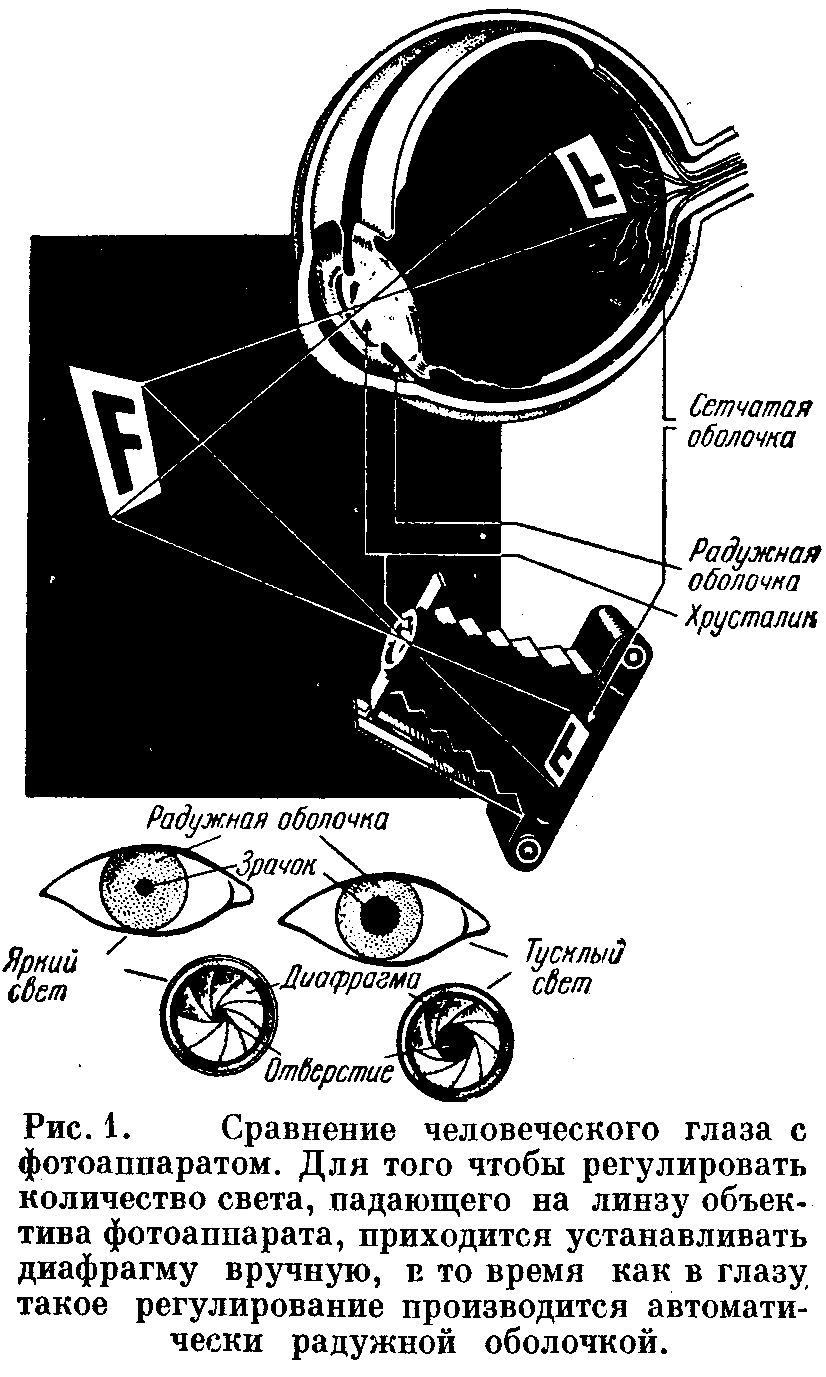 2. Строение глаза. Часто проводят аналогию между глазом и камерой Обскурой, но как большинство аналогий эта верна лишь частично. Глаз – это бесконечно более тонкий и сложный прибор, чем наилучший фотоаппарат, хотя в общем они похожи. В фотоаппарате (рис.1), имеется простая собирательная линза или их система, которая действует наподобие собирательного хрусталика глаза. Чувствительность к свету сетчатой оболочки на задней стороне глаза соответствует чувствительной плёнке в фотоаппарате; ту и другую получают перевёрнутые, действительные, уменьшенные изображения. Радужная оболочка регулирует количество света, входящего в глаз, а диафрагма регулирует количество света, допускаемого в фотоаппарат;. В на ярком свете зрачок имеет размер булавочной головки, а в темноте отверстие радужной оболочки может иметь диаметр почти 1см.