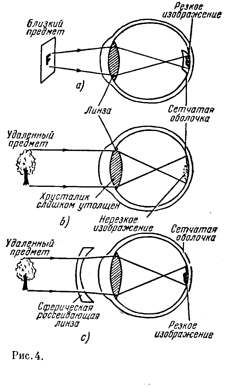 6. Близорукость. В том случае, если расстояние между сетчатой оболочкой и хрусталиком ненормально велико или хрусталик настолько закруглён и толст, что его фокусное расстояние ненормально мало, изображение удалённого предмета попадает перед сетчатой оболочкой (рис. 4). Этот дефект глаза очень распространён и называется близорукостью или миопией. Близорукость – это такой дефект глаза, который чрезвычайно распространён среди школьников и студентов. Согласно данным специалистов каждые 3 новорождённых из 100 обладают этим дефектом; в начальной школе число близоруких составляет примерно 10 из 100; в средней школе число близоруких достигает 24%, а в колледже – 31%. Среди диких племён, живущих и работающих большей частью на открытом воздухе, близорукость почти неизвестна. Точно также среди фермеров и лиц, работающих на открытом воздухе, очень малое количество страдает от близорукости, если только они не приобрели её в школе или при работе с близкими объектами. Причиной близорукости в большинстве случаев является, по-видимому, то, что в детстве глаз легко деформируется. При работе с близкими предметами глазное яблоко “привыкает” удлиняться на столько, что хрусталик уже теряет способность сплющиваться для фокусирования изображения удалённого предмета на сетчатой оболочке без избыточного напряжения. Сравните длину близорукого глаза на рис. 4 с длиной дальнозоркого на рис. 5.