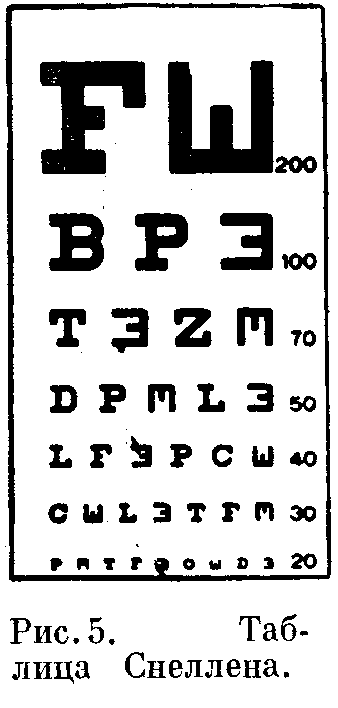 7. Испытание на близорукость. Один из видов проверки на миопию делается при помощи таблицы Снеллена. Таблица Снеллена в уменьшенном виде изображена на рис. 5. При нормальном зрении можно читать седьмую строчку хорошо освещённой таблицы стандартных размеров каждым глазом в отдельности с расстоянием в 50 см. Неспособность сделать это не обязательно свидетельствует о близорукости, так как эта непосредственность может быть вызвана другой причиной. Но если отрицательная (рассеивающая) сферическая линза улучшает видимость (при этом нужно начать с линзы малой оптической силы и постепенно увеличивать силу линзы), то можно предположить наличие близорукости. Близорукость можно исправить, но не вылечить, при помощи очков. В этом случае применяются рассеивающие сферические линзы (рис. 4.с). Эта линза рассеивает параллельные световые волновые лучи, исходящие от удалённых предметов в достаточной степени для того, чтобы изображение попало на сетчатую оболочку дальше того места, где оно находилось бы без применения очков.