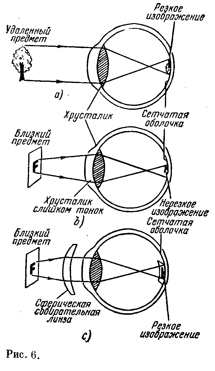 8. Гиперопия, или дальнозоркость. Если расстояние между сетчатой оболочкой и хрусталиком ненормально мало или если хрусталик ненормально тонок и сплющен, так что фокусное расстояние его ненормально велико, то изображение близких предметов оказывается за сетчатой оболочкой (рис.6). Следовательно, близкие предметы не могут быть видимы без напряжения глаза. Если вы только дальнозорки и не имеете никаких других недостатков зрения, то вы легко прочтёте 9-ю строчку таблицы Снеллена, но ваша ближняя точка может оказаться дальше своего нормального положения. Для исправления гиперопии следует уменьшать расстояние изображения для близких предметов. Это требует применения собирательной (положительной) линзы соответствующей оптической силы (рис. 6.с).