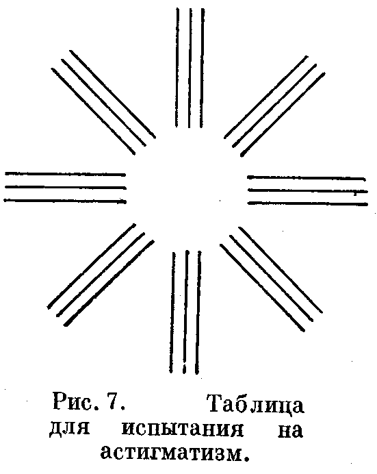 Астигматизм можно обнаружить при помощи рис.7. Нормальный глаз видит группы линий, изображенных на рисунке с одинаковой чёткостью на всех расстояниях от глаза. В случае, если глаз имеет астигматизм (каждый глаз проверяется отдельно), вертикальные или горизонтальные линии или некоторые линии между ними кажутся чёткими и чёрными, а линии, расположенные под прямым углом к ним, кажутся менее тёмными.