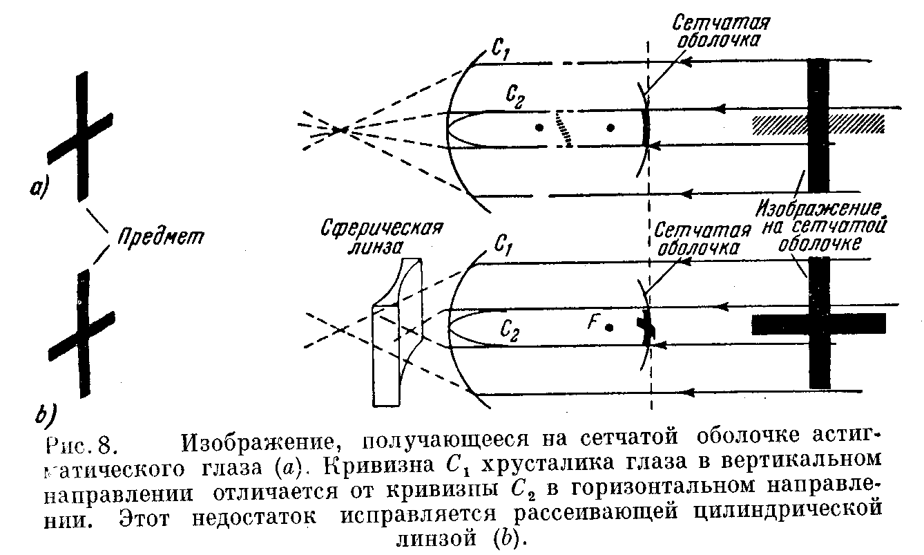 Астигматизм может причинить головные боли и создавать расплывчатость, в особенности, если читать длительное время подряд. Астигматизм исправляется цилиндрической линзой вместо сферической, как показано на рис. 8. Отметьте, в частности, что направление кривизны линзы очков должно совпадать с соответствующей кривизной глазного хрусталика. Следовательно, если астигматическая линза меняет своё положение относительно глаза, необходимо принять меры, чтобы вернуть её на место, так как совершенно необходимо, чтобы соответствующие кривизны совпадали.