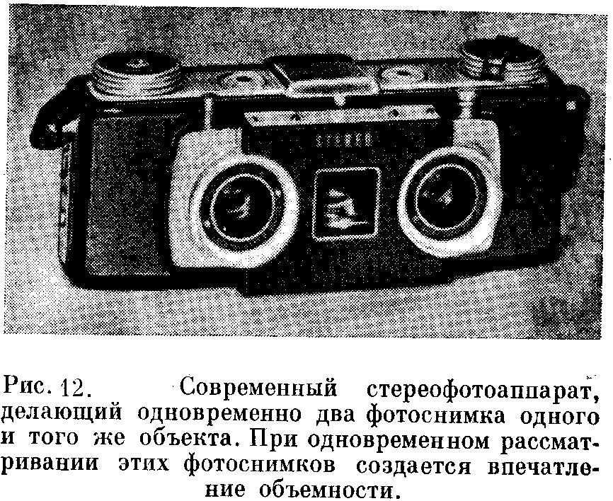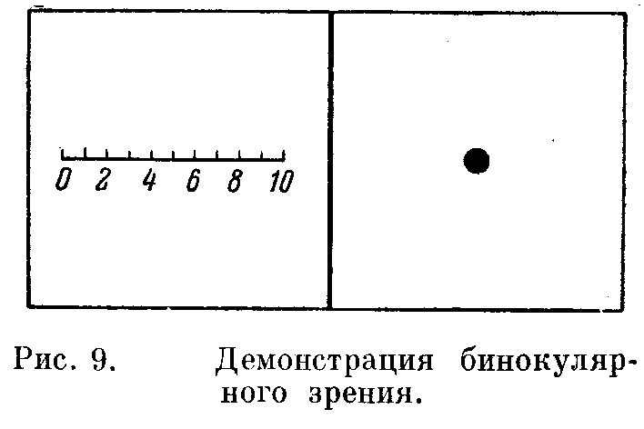 Бинокулярное зрение можно иллюстрировать, расположив небольшой кусок картона перпендикулярно к рис. 9 вдоль его средней линии и приложив нос к верхнему ребру картона, так что каждый глаз будет видеть только половину всего рисунка. В результате этого вы увидите одно трёхмерное изображение, имеющее не только длину и ширину, но и глубину. Другой хорошей иллюстрацией бинокулярного зрения являются старинный стереоскоп. Два изображения одного и того же предмета снимаются одновременно двумя фотоаппаратами, расположенными на расстоянии нескольких сантиметров друг от друга, и готовые фотографии наклеиваются рядом на куске картона. Этот картон вставляется в стереоскоп так, что каждая из фотографий оказывается перед призмой и положительной линзой и каждый глаз видит только одну из фотографий. Призмы позволяют слить два изображения, а положительные линзы несколько увеличивают фотографии. В результате обе фотографии представляются в виде одного трёхмерного изображения, обладающего глубиной и всеми свойствами натуры. Левое изображение изображает несколько большую часть левой стороны трёхмерного тела, а правое изображение – несколько большую часть правой стороны это создает видимость глубины. Возможно также, что на той или иной фотографии может получиться несколько большая часть верхней или нижней стороны предмета. Эффект глубины получается при слиянии этих двух слегка различающихся изображений.