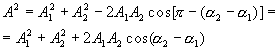 Вектор A вращается с той же угловой скоростью ω 0 , как и векторы А 1 и А 2 , так что сумма x 1 и х 2 является гармоническим колебанием с частотой (ω 0 , амплитудой A и начальной фазой α . Используя теорему косинусов получаем, что