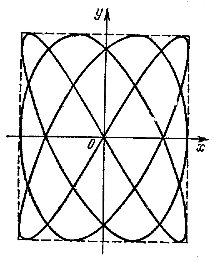 (знак плюс в выражении для у соответствует движению против часовой стрелки, знак минус — движению по часовой стрелке). При разных частотах взаимно перпендикулярных колебаний, траектории результирующего движения будут имеют вид сложных кривых, называемых фигурами Лиссажу.