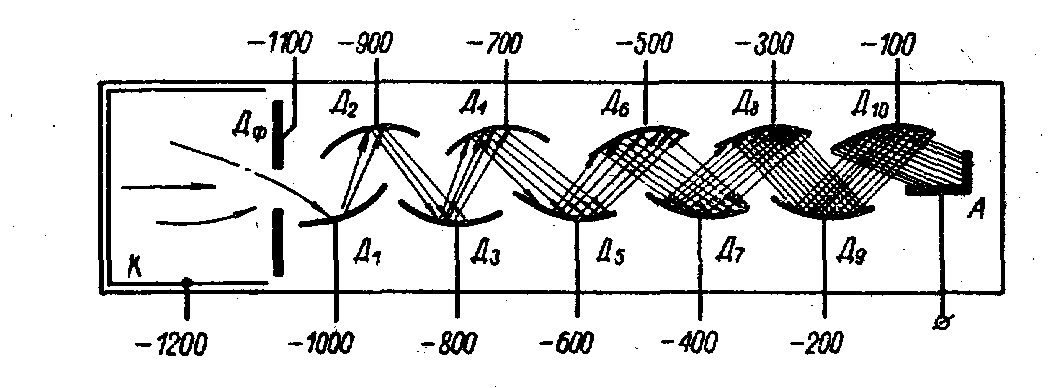 Рис. 4. Принципиальная схема ФЭУ. Свойства фотокатода характеризуются также интегральной чувствительностью, представляющей собой отношение фототока (мка) к падающему на фотокатод световому потоку (лм). Квантовый выход катода, т. е. вероятность вырывания фотоэлектрона фотоном, попавшим на фотокатод также является одной из его характеристик. Величина e может достигать 10-20%. Фотокатод наносится на стекло в виде тонкого полупрозрачного слоя. Толщина этого слоя имеет значение. С одной стороны, для большого поглощения света она должна быть значительной, с другой стороны, возникающие фотоэлектроны, обладая очень малой энергией не смогут выходить из толстого слоя и эффективный квантовый выход может оказаться малым, поэтому подбирается оптимальная толщина фотокатода. Также важно обеспечить равномерную толщину фотокатода, чтобы его чувствительность была одинакова на всей площади. В сцинтилляционной g -спектрометрии часто необходимо использовать твердые сцинтилляторы больших размеров, как по толщине, так и по диаметру, поэтому возникает необходимость изготавливать ФЭУ с большими диаметрами фотокатодов. Фотокатоды в отечественных ФЭУ делаются с диаметром от нескольких сантиметров до 15 ¸ 20 см. фотоэлектроны, выбитые из фотокатода, должны быть сфокусированы на первый умножительный электрод. Для этого используется система электростатических линз, которые представляют собой ряд фокусирующих диафрагм. Для получения хороших временных характеристик ФЭУ важно создать такую фокусирующую систему, чтобы электроны попадали на первый динод с минимальным временным разбросом. Важной характеристикой ФЭУ является коэффициент умножения М. Если значение s для всех динодов одинаково (при полном сборе электронов на динодах), а число динодов равно n, то