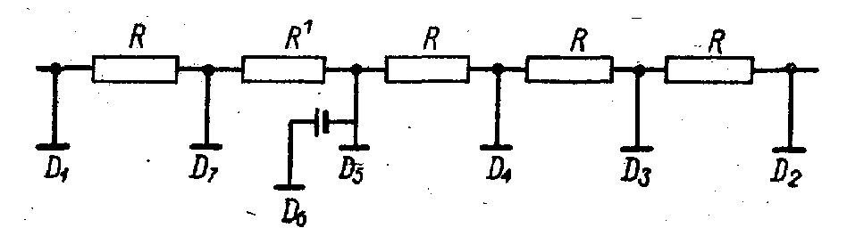 Рис. 7. Часть схемы делителя. одного из динодов по отношению к потенциалу предыдущего динода задается постоянным, либо с помощью дополнительной батареи, либо с помощью дополнительно стабилизированного делителя. На рис.7 приведена часть схемы делителя, где между динодами D 5 и D 6 включена дополнительная батарея ( U б = 90 в). Для получения наилучшего эффекта самостабилизации необходимо подобрать величину сопротивления R'. Обычно R' больше R в 3— 4 раза. Помехи в фотоумножителях и их ликвидация. Даже при отсутствии внешнего облучения в сцинтилляционных счетчиках возможно появление большого числа импульсов на выходе ФЭУ. Эти импульсы обычно имеют небольшие амплитуды и носят название шумовых. Наибольшее число шумовых импульсов обусловливается появлением термоэлектронов из фотокатода или даже из первых динодов. Для уменьшения шумов ФЭУ часто используется его охлаждение. При регистрации излучений, создающих большие по амплитуде импульсы, в регистрирующую схему включается дискриминатор, не пропускающий шумовые импульсы.