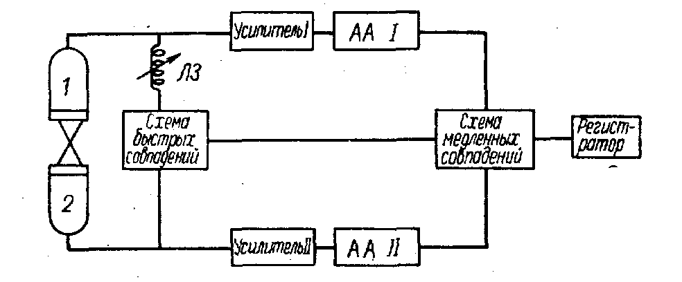 Рис.8. Принципиальная схема для определения времени жизни возбужденных состояний ядер. Далее импульсы с анализаторов, а также с быстрой схемы совпадений подаются на медленную ( t ~10 -6 сёк) схему тройных совпадений. В эксперименте изучаются зависимость числа тройных совпадений от величины временной задержки импульса, включенной в первый канал схемы быстрых совпадений. Обычно задержка импульса осуществляется с помощью так называемой переменной линии задержки ЛЗ (рис.8). Линия задержки должна включаться именно в тот канал, в котором регистрируется квант g 1 , так как он испускается раньше кванта g 2 . В результате эксперимента строится полулогарифмический график зависимости числа тройных совпадений от времени задержки (рис.9), и уже по нему определяется время жизни возбужденного уровня I (так же, как это делается при определении периода полураспада с помощью одиночного детектора). Используя сцинтилляционные счетчики с кристаллом NaJ(Tl) и рассмотренную схему быстро-медленных совпадений, можно измерять времена жизни 10 -7 —10 -9 сек. Если же использовать более быстрые органические сцинтилляторы, то можно измерять и меньшие времена жизни возбужденных состояний (до 10 -11 сек ) .