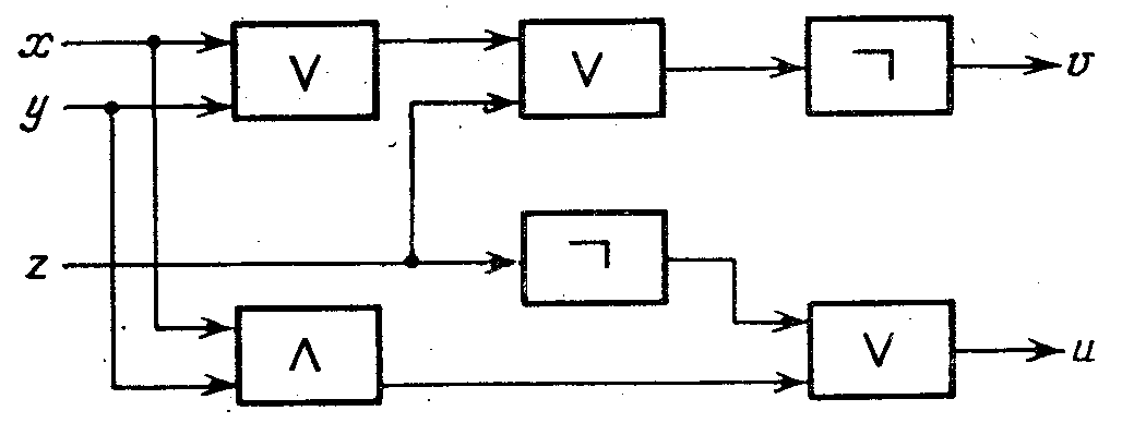 схемы, подсоединяя выходы одних элементов к входам других. Если при таких соединениях избегать возникновения замкнутых контуров (например, подсоединения выхода элемента на один из его собственных входов), то возникает класс схем, называемых обычно комбинационными схемами. Такие схемы находятся в однозначном соответствии с формулами булевой алгебры, так что с их помощью может быть выражена любая система булевых функций. Например, схема, изображенная на рис. 2, реализует систему булевых функций u = x /\ y \/ ù z и v = ù (x V y V z). На практике построение комбинационных схем усложняется, поскольку сигналы при прохождении через вентили ослабляются, искажают свою первоначальную форму, запаздывают. Поэтому необходимо наряду с логическими элементами включать в схему различного рода согласующие элементы (усилители, формирователи сигналов и др.). Задача этих элементов—сделать схему работоспособной и надежной.