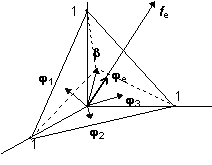 Рис.1. f e - вектор выходных сигналов детекторов, отвечающий излучению e( × ), j e - его цвет; j 1 , j 2 , j 3 , - векторы (цвета) базовых излучений, b - белый цвет, конец вектора b находится на пересечении биссектрис.
