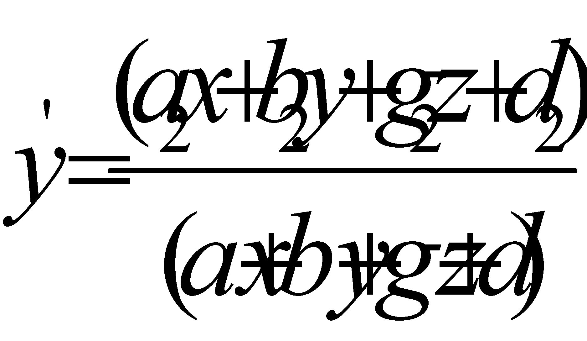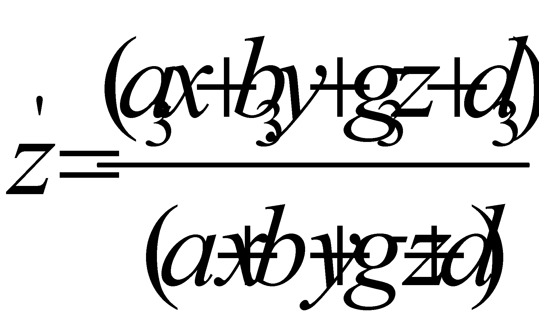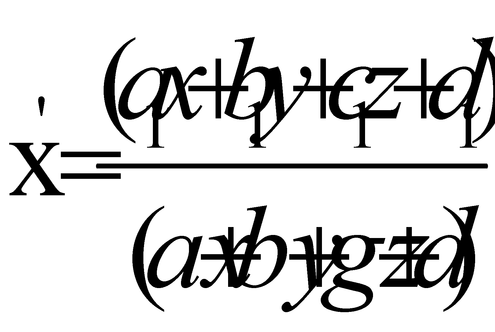 Разделим почленно первое равенство на второе : sx / 1 /sx / 2 =(c 11 x 1 +c 12 x 2 ) / (c 21 x 1 +c 22 x 2 ) , учитывая , что x / =x / 1 / x / 2 , и x=x 1 / x 2 . Преобразуем x / =(c 11 x+c 12 )/ (c 21 x+c 22 ) , введя новые обозначения : a=c 11 , b=c 12 , g=c 21 , d=c 22 x / =(ax+b) / (gx+d) - т.е. в неоднородных координатах проективное преобразование выражается дробно - линейной функцией. ad -bg №0