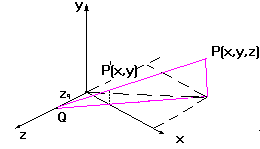 Неоднородные координаты точки P / получаем отсюда : X=x/(1-z/z q ) , Y=y/(1-z/z q ) ,Z=0