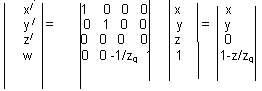 Если взять семейство параллельных оси z прямых, то после такого проективного преобразования каждая из них пройдет через указанную точку (0,0,-z q ) на оси z .Поэтому эту точку называют точкой схода. Аналогично, матрицы