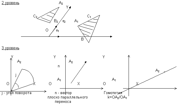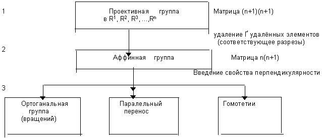 4) условием существования обратного элемента является условие существования обратной матрицы, для последнего необходимо, чтобы [c]#0 это условие является требованием проективного преобразования. Группу проективных преобразований называют проективной группой. Прежде чем рассмотреть матрицы проективных преобразований, соответствующих конкретным их типам, вспомним иерархию геометрических преобразований.