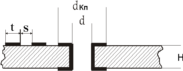Рис 6 d – диаметр отверстия. d кп – диаметр контактной площадки. S – расстояние между контактными площадками или контактной площадкой и проводником. t – ширина печатного проводника. H – ширина печатной платы.