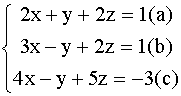 Коэффициенты a 11 , 12 ,..., a 1n , ... , a n1 , b 2 , ... , b n считаются заданными . Вектор -строка í x 1 , x 2 , ... , x n ý - называется решением системы (1), если при подстановке этих чисел вместо переменных все уравнения системы (1) обращаются в верное равенство. Определитель n-го порядка D = ç A ê = ç a ij ç , составленный из коэффициентов при неизвестных , называется определителем системы (1). В зависимости от определителя системы (1) различают следующие случаи. a). Если D ¹ 0 , то система (1) имеет единственное решение, которое может быть найдено методом ГАУССА . б). Если D = 0 , то система (1) либо имеет бесконечное множество решений , либо несовместна ,т.е. решений нет. 2. МЕТОДИЧЕСКИЕ РЕКОМЕНДАЦИИ 1. Рассмотрим систему 3-х линейных уравнений с тремя неизвестными.