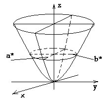 Рассмотрим геометрические свойства конуса. В сечение этой поверхности плоскостью Oxy (y=0) получаем линию
