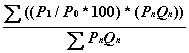 Подсчет индекса Данный индекс вычисляется следующим образом: цены текущего периода умножаются на фиксированные веса, и результаты суммируются. Затем цены базового периода умножаются на фиксированные веса, и результаты так же суммируются. Затем мы делим первую сумму на вторую и умножаем полученный результат на 100 для представления отношения в виде процента.