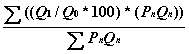P n Q n - стоимость; P 1 - цены текущего периода; P 0 - цены базового периода. P n и Q n - цены и количества, которые определяют значения, используемые нами как веса. В частности: n = 0 для базового периода: n = 1 для текущего периода; n = 2 для фиксированного периода. Следовательно, в случае базовых стоимостей формула (3.7) примет вид: