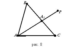 Выберем на плоскости произвольный треугольник АВС (рис. 8), который в дальнейшем назовем координатным , или базисным треугольником Мебиуса. Пусть р № 0 и (Р, р) ѕ произвольная материальная точка, лежащая в плоскости этого треугольника. Тогда возможно подобрать для точек А , В , С такие массы а , b , с (не обязательно положительные), чтобы объединением трех материальных точек (А, а) , (В, b) и (С, с) служила точка (Р, р) . Это можно себе представить следующим образом. Ясно, что не может быть одновременно РА ЅЅ ВС, РВ ЅЅ СА, РС ЅЅ АВ . Пусть, для определённости, РА и ВС не параллельны. Соединим Р с А и отметим точку А 1 , в которой АР встречает прямую ВС . Подберём три действительных числа а, b, c так, чтобы b Ч BA 1 = c Ч A 1 C , a Ч AP = (b + c) Ч PA 1 , a + b + c = p. Это всегда возможно сделать. Тогда (P, p) = (A, a) + (B, b) + (C, c). Обратно, если возьмём три произвольных действительных числа a, b, c , причём a + b + c № 0 , то существует вполне определённая материальная точка (Р, р) такая, что (Р, р) = (A, a) + (B, b) + (C, c). Таким образом, каждую материальную точку Р є (Р, р) на плоскости можно вполне охарактеризовать тремя числами, а именно тремя массами a, b и с , которые надо поместить в вершинах базисного треугольника, чтобы точка Р оказалась объединением трёх образующихся при этом материальных точек (A, a), (B, b) и (C, c) . Эти три числа называют барицентрическими координатами материальной точки Р (“барицентр” означает “центр тяжести”): а — первая барицентрическая координата, b — вторая, с — третья. Понятно, что те же три числа a, b, c определяют также положение носителя материальной точки Р . Поэтому эти три числа называют также барицентрическими координатами (геометрической) точки Р . Таким образом, выражение “барицентрическими координатами точки Р служат числа a, b, c ” означает только то, что имеет место равенство (A, a) + (B, b) + (C, c) = (P, p), где p = a + b + c. Если массы трёх материальных точек увеличить (или уменьшить) в одно и то же число раз, то от этого положение их центра тяжести не изменится. Поэтому барицентрическими координатами геометрической точки Р будут также числа k Ч a, k Ч b, k Ч c, где k — любое действительное число, не равное нулю. Итак, геометрическая точка Р (в отличие от материальной точки Р ) имеет бесконечно много троек барицентрических координат, причём каждая из этих троек может быть получена из какой-либо одной тройки ( a, b, c ) путём умножения на какую-либо константу k , отличную от нуля. Если точка Р находится внутри координатного треугольника, то все три её барицентрические координаты одного знака (их можно считать положительными). Если точка Р — на какой-либо стороне координатного треугольника или на её продолжении, то хотя бы одна барицентрическая координата этой точки равна нулю. В остальных случаях две координаты точки Р — одного знака, а третья имеет противоположный знак. Если точка Р расположена внутри базисного треугольника ABC , то в качестве её барицентрических координат можно принять площади треугольников BPC, CPA и APB . Применение барицентрических координат позволяет внести одно существенное упрощение в рассуждения, связанное с рассмотрением материальных точек : рассмотрение любых произвольно расположенных материальных точек в любом числе сводится к рассмотрению только таких материальных точек, которые имеют носителями вершины базисного треугольника.