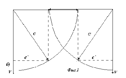 что является переходом от преобразований Лоренца к преобразованиям Галилея. При v > c наша модель теряет смысл. В модели можно определить и так называемое пространство событий . Очевидно, что им является полуплоскость над прямой ДД ` , где каждая точка может быть охарактеризована временем и местом. Рассмотрим, как в модели интепретируется проблема одновременности двух событий. Пусть из точки М (фиг. 1а), лежащей посредине между А и В , в системе K в точки A и B испущены световые сигналы. В собственной системе отсчета K наблюдатель в Д обнаружит, что эти сигналы придут в точки A и B одновременно. Однако с точки зрения наблюдателя в Д ` , эти сигналы в точки A` и B` придут неодновременно. Таким образом, понятие одновременности становится относительным в зависимости от того, по отношению к какой системе отсчета рассматривается этот процесс. Далее, согласно СТО, чтобы измерить длину движущегося стержня относительно неподвижной системы отсчета, необходимо определить координаты конца и начала стержня в этой системе отсчета, но обязательно одновременно. Это требование одновременности ведет к тому, что длина стержня при измерении его в системе отсчета, относительно которой он движется, оказывается меньше, чем при измерении его в системе отсчета, где он покоится. То есть