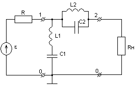 Рис.2 Схема фильтра. Воспользуемся упрощенным вариантом определения функции передачи обратимой цепи, где за основу примем диагональную матрицу собственных проводимостей узлов, умножив для удобства все ее элементы на частоту p: