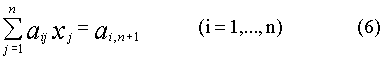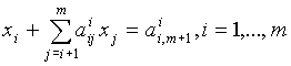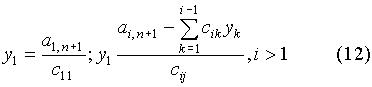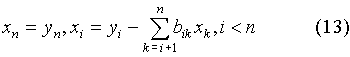 неизвестные y i удобно вычислять вместе с элементами b ij . После того как все y i определены по формулам (12), подставляем их в уравнение (10). Так как коэффициенты b ij определены (8), то значения неизвестных, начиная с последнего, вычисляем по следующим формулам: