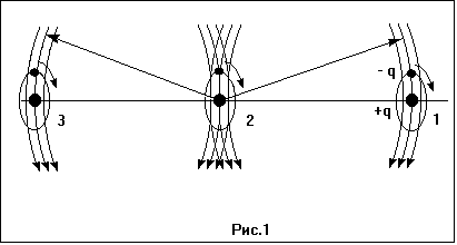На рисунке рис.1 показана устойчивая группа из трех излучающих электрических диполей, которые равномерно и совместно вращаются вокруг общей оси (отрицательный заряд вокруг тяжелого положительно заряженного тела), и фрагменты электрических полей, излученных ранее соседними диполями. Чтобы не загромождать рисунок, показаны лишь участки электрического поля, параллельные плоскости рисунка, и лишь вблизи диполей. Диполи занимают в полях друг друга устойчивые положения, т.к. находятся в максимумах электрического поля, как в потенциальных ямах, вращаются вместе с полем, и их подвижные заряды всегда смещены вдоль поля к нижнему энергетическому уровню в нем. Будучи выведены из устойчивых положений, диполи вернутся в них или придут к новым устойчивым положениям. Такую же способность к самоорганизации в пространстве имеют почти любые синхронные между собой источники волновых полей. Упругие связи через посредство электромагнитных волн не могут не возникать и между элементами микромира. Поля в нем достаточно сильны. Классические теории не знают других полей и сил, способных удерживать элементы на устойчивых расстояниях, поэтому нам придется признать, что в упругом теле элементы микромира выступают в качестве носителей электромагнитных колебаний и источников волн, и связаны между собой через посредство электромагнитных волновых полей. Теперь мы знаем пример макроскопической системы, самоорганизующейся по структуре в пространстве, - группу из нескольких высокочастотных магнитов, быстро вращающихся диполей или каких-либо иных излучающих волновое поле осцилляторов, свободно плавающих в невесомости или в жидкости. Самоорганизация будет более полной, а системы - ближе к естественным, если колебания в элементах будут автономны и тоже подвержены самоорганизации, самосогласованию их по частоте и текущим фазам. Сделать такую систему для примера можно (даже в виде изделий, если очень понадобится) средствами радиотехники. Рассмотрим систему, состоящую снова из множества одинаковых катушек, обтекаемых токами СВЧ, но пусть теперь каждая катушка будет частью автономного генератора электрических колебаний СВЧ, каждый из которых состоит из колебательного контура (конденсатора и этой катушки), усилителя, источника тока и цепи положительной обратной связи. Такие генераторы давно применяются, свойства их хорошо известны, что упрощает задачу. Пусть катушки снова служат излучателями и электромагнитами, а прочие части генераторов полей не излучают. Колебательный контур, включенный в схему генератора, - это простейший резонатор, локальная колебательная система, содержащая незатухающий колебательный процесс. Одинаковые генераторы, будучи разрозненными, вырабатывают колебания немного неравных частот и в произвольных фазах. Находясь на некоторых умеренных расстояниях друг от друга, они взаимосвязаны через свои излучения, влияют друг на друга. Каждая катушка излучает энергию в виде электромагнитных волн и принимает энергию излучений других катушек, преобразуя ее в энергию электрических колебаний. Так колебательный процесс от каждого генератора распространяется на все другие генераторы, влияя на них. При этом генераторы, если располагаются более-менее определенным образом на некоторых расстояниях друг от друга, способны входить в 