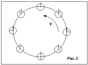 На рисунке 3 показано такое кольцо. Элементы и процессы в нем представлены в виде часов, показывающих текущую фазу процесса. Квантуются все связанные волновыми полями движения, и мы не привыкли к этому лишь потому, что сильных волновых полей и очень больших скоростей нет в нашей практике. А здесь показан лишь наиболее простой и наглядный пример квантования. Рассчитывая устойчивые формы такой вот структуры: кольцо из одинаковых электрически заряженных источников волновых излучений и противоположно заряженное тело в центре, получим серию устойчиво вращающихся в поле колец, диаметры которых и число элементов в которых (точнее: число мест в кольце) пропорциональны 2n 2 (2, 8, 18, 32 …), т.е. такие структуры во многом подобны атому. Правда, мы уже потеряли уверенность в том, что электроны вообще вращаются вокруг ядра, поскольку электростатические силы притяжения могут быть, в принципе, уравновешены не только силами инерции, но и электродинамическими силами отталкивания. Поскольку электроны – тоже какие-то колебательные системы, то они могут складываться в подобные структуры естественным образом. У нас еще недостаточно причин для уверенности, но уже нельзя говорить, что классическая физика не способна объяснить строение атома.