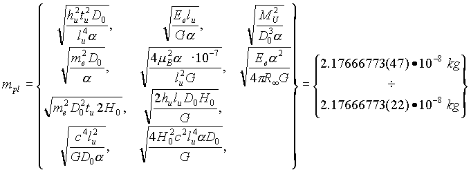 В таблицах 1, 2, 3 приведены значения планковских единиц, полученных по приведенным выше формулам: Табл.1. Расчетные значения планковской массы.