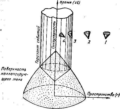 Рис. 2. Диаграмма пространства-времени при сферическом ' коллапсе. Достаточно массивное тело с течением времени : сжимается под действием сил тяготения, пересекает горизонт Событий и в конце концов сжимается в точку. Цифрами обозначены локальные световые конуса. Сигнал из точек 1 и 2 может дойти до внешнего наблюдателя, из точек 3 и 4, т. е. из-под гравитационного радиуса, не может
