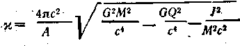 ла приобретают одну и ту же угловую скорость вращения, равную OMEGA=(J/M)[R 2 g +(J/Мс) 2 ] -1 . Эта величина получила название угловой скорости вращения черной дыры. OMEGA постоянна на поверхности черной дыры. В этом смысле вращение черной дыры напоминает вращение твердого тела. Так же как и при коллапсе невращающегося тела, возрастающее красное смещение при приближении поверхности тела к горизонту и падение по экспоненциальному закону мощности излучения, выходящего к отдаленному наблюдателю, приводят к тому, что через характерные времена порядка R g /c перестает выходить наружу информация и образуется черная дыра. Заряженные черные дыры. Если коллапсирующее тело обладало электрическим зарядом, то возникающая черная дыра “помнит” об этом. Падение электрического заряда Q в черную дыру приводит к тому, что поток электрического поля через ее поверхность оказывается равным 4piQ в полном соответствии с теоремой Гаусса. Силовые линии электрического поля выходят из черной дыры, и вне ее имеется электрическое поле. Если черная дыра не вращается, то это поле описывается законом Кулона. Вращение заряженной черной дыры с массой М и угловым моментом J приводит к дополнительному появлению дипольного магнитного поля, причем магнитный момент оказывается равным: мю= (Q/M)J. Соответствующее точное решение уравнений Эйнштейна, обобщающее решение Керра на случай, когда черная дыра обладает электрическим зарядом, было получено в 1965 г. в работе группы американских теоретиков во главе с профессором Эзрой Ньюмапом. Как выяснилось позднее, это решение, получившее название решения Керра—Ньюмана, однозначно определяемое тремя параметрами: М - массой, J — угловым моментом и Q — электрическим зарядом, является самым общим из возможных решений, описывающих стационарную черную дыру в пустоте. Геометрические свойства керр-ньюмановской черной дыры весьма сходные с описанными выше свойствами керровской черной дыры. Поверхность черной дыры при наличии вращения перестает иметь сферическую форму. Площадь поверхности керр-ньюмановской черной дыры равна A = 4pi [R 2 g + (J/Mc) 2 ] =4piG 2 с -4 (2M 2 —Q 2 /G+. + 2Мsqrt[ M 2 —Q 2 /G—J 2 c 2 /G 2 M 2 ]). При описании свойств черных дыр важную роль играет так называемая поверхностная гравитация kappa
