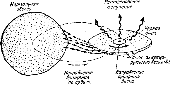 Рис. 6. Аккреция на черную дыру в двойной системе. Сплошной стрелкой показано направление вращения аккреционного диска, пунктирной — вращения двойной системы относительно центра масс солнечных масс), то это можно рассматривать как свидетельство того, что невидимая компонента является черной дырой, поскольку маловероятно для обычной звезды с такой большой массой остаться “невидимой”, а для звезд-малюток (белых карликов и нейтронных звезд) эти массы лежат вне допустимого предела их устойчивости. Предложение использовать “невидимость” в качестве, критерия при поиске черных дыр в двойных системах было высказано в начале 60-х гг. советскими астрофизиками Я. Б. Зельдовичем и О. X. Гусейновым. Однако среди звезд, отобранных по этому признаку, черную дыру, к сожалению, обнаружить не удалось. Во-вторых, среди многочисленных двойных звезд существует довольно много тесных двойных систем, у которых расстояние между компонентами сравнимо с суммой радиусов звезд. Если черная дыра входит в состав такой системы, то скорость аккреции на нее значительно возрастает за счет вещества, перетекающего от обычной звезды и может достигнуть величины 10 -5 солнечной массы в год. Вещество, перетекающее от звезды, вследствие, вращения системы обладает большим угловым моментом, поэтому частицы не смогут сразу упасть на черную дыру и “вынуждены” занять круговую орбиту, соответствующую имеющемуся у них угловому моменту. В среднем порции газа требуется несколько недель или месяцев для того, чтобы упасть в черную дыру. Таким образом, вокруг черной дыры образуется диск из аккрецирующего вещества (рис. 6). Плоскость этого диска совпадает с плоскостью, в которой движутся компоненты двойной системы, его диаметр составляет несколько миллионов километров, а толщина меньше 150000 км. Работа гравитационных сил частично превращается в кинетическую энергию движения газа, частично, из-за трения, переходит в тепло и разогревает аккрецирующий газ, который начинает интенсивно излучать рентгеновские лучи. Светимость диска может в сотни тысяч раз превосходить общую светимость Солнца, поэтому поиск черных дыр целесообразно вести, изучая мощные компактные космические источники рентгеновского излучения. Лебедь Х-1 — черная дыра? Один из рентгеновских источников в двойных системах, расположенный в созвездии Лебедя и получивший название Лебедь Х-1, привлек к себе внимание. В 1971 г. в результате исследований этого источника на американском спутнике “Ухуру” и с помощью рентгеновских телескопов па высотных баллонах удалось с большой точностью установить его положение. В том же году были зарегистрированы изменения его рентгеновской светимости и одновременно с этим наблюдалось резкое возрастание излучения от радиоисточника, расположенного в этом же районе. Это позволило отождествить рентгеновский и радиоисточники и тем самым зафиксировать положение рентгеновского источника с точностью до угловой секунды. Внутри этой области была обнаружена горячая го лубая звезда HDE 226868, которая оказалась спектрально двойной, с периодом 5,6 суток. Позднее было обнаружено, что и излучение рентгеновского источника обладает периодической компонентой с таким же периодом. Тем самым было доказано, что рентгеновский источник входит в двойную систему вместе со звездой HDE 226868. Эта звезда рас