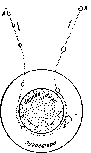 Рис. 7. Процесс Пенроуза. Тело, падающее с некоторого расстояния (положение A), влетает в эргосферу вращающейся черной дыры и распадается в точке