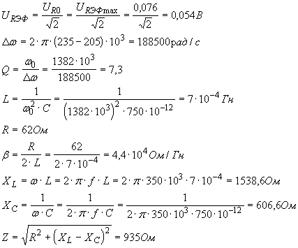 Задание 1. Исследование зависимости амплитуды вынужденных колебаний от частоты (резонансная кривая). Исходные данные:U вых =200 мВ, e ЭФ =200 мВ. f Î [180;300] кГц. Расчеты необходимых величин:
