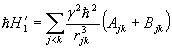 Прежде всего, рассмотрим несколько подробнее взаимодействие между двумя спинами, которые будем обозначать для краткости i и i’. Пусть q и j — полярные координаты вектора r, описывающего их взаимное положение, причем ось z направлена параллельно внешнему полю. Тогда W ii можно записать в виде W ii ' = { iЧ i' — 3[ i z cos q + sin q ( i x cos j + i y sin j )]x[ i' z cos q + sin q ( i' x cos y + + i' y sinj )]}g 2 ħ 2 /r 3 = { iЧ i' — 3[ i z cos q + sin q ( i + e - ij + i - e ij )/2]x[ i' z cos q + sin q ( i + e - ij + + i - e ij )/2)]}g 2 ħ 2 /r 3 = (A+B+C+D+E+F)g 2 ħ 2 /r 3 , (17) где A = i' z i z (l – 3cos 2 q ), B = – (l – 3cos 2 q ) (i + i' – + i – i' + ) = (l – 3cos 2 q )(i z i' z – iЧ i' )/2, C = – 3sinq cosq e - ij (i z i' + + i + i' z )/2, (18) D = С* = – 3sinq cosq e ij (i z i' – + i – i' z )/2, E = – 3sin 2 q e -2 ij i + i' + /4, F = E* = – 3sin 2 q e -2 ij i – i' – /4,. Запись W в такой форме вызвана следующими причинами. Согласно формуле (14), c ў ў ( w ) ~ S ў | < п | M x | n’ >| 2 . Это приводит к необходимости определить изменение в положении энергетических уровней, отвечающих ħ H 0 , обусловленное наличием ħ H 1 . Операторы А, В, С, D, E, F дают качественно различным вклады в это изменение. Упомянутые операторы, действуя на состояние невозмущенного гамильтониана, характеризующееся значениями i z =т , i ' z =т', приводят к следующему изменению этого состояния:
