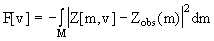 где интеграл берется по объему ОК. В. Обратная задача Пусть v(r) - оценка истинной функции v true (r) , Z obs (m) - измеренный импеданс ВТП в точке r 0 на частоте возбуждения w , m=(r 0 , w ) - вектор в некоторой области определения M , Z[m,v] - оценка величины Z obs (m) на основе решения прямой задачи. Определим функционал невязки измеренных и рассчитанных значений импеданса ВТП как :