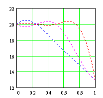 9.2 Модели реальных распределений электропроводности Модель задачи должна описывать некоторую пластину, подвергнутую поверхностной обработке. Для определенности зададим толщину пластины равной двум сантиметрам. На основе данных из Приложения 2 зададим значения ЭП вблизи нижней и верхней поверхностей соответственно 20 (МСм/м) и 13 (МСм/м) . Для решения обратной задачи необходимо задать априорную информацию о величине ЭП в узлах аппроксимации. В качестве таковой примем интервал [8,25] (МСм/м) , полученный внесением 25% отклонения от считаемых истинными значений. Это отклонение моделирует неточность априорной информации. Из-за особенностей реализации алгоритма устойчивость решения сильно зависит от точности задания ЭП в узле, соответствующем нижней поверхности пластины, поэтому ограничение в нем зададим интервалом [19,21] (МСм/м) . В нашем случае все возможные модели распределений ЭП могут быть разделены на два класса. Распределения относящиеся к первому из них условно назовем глубинными. В них ЭП претерпевает существенные изменения на протяжении всей глубины пластины. Второй класс образуют распределения, ЭП в которых заметно изменяется лишь в приповерхностном слое глубиной порядка четверти пластины., поэтому назовем эти распределения поверхностными. Критерием отличия восстановленной функции распределения ЭП от модельной будем считать величину относительной погрешности, поскольку сравнение результатов с ее помощью вполне адекватно целям нашей работы. Следует отметит, что погрешность восстановления для поверхностных распределений ЭП представляет практический интерес в области, примерно ограниченной глубиной порядка четверти пластины, что обусловлено физическим смыслом поверхностной обработки. Поэтому для случаев поверхностных распределений основное внимание будем уделят именно указанным глубинам. Для проверки возможности восстановления приповерхностных изменений ЭП рассмотрим две базовые модели поверхностных распределений.