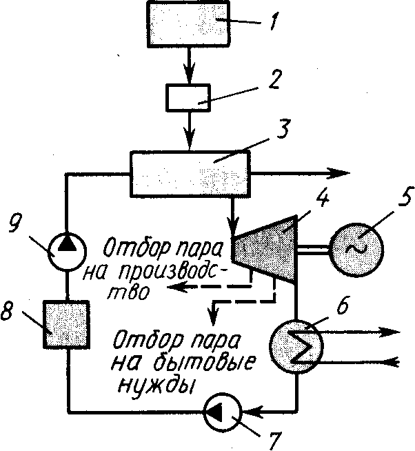 Теплоэлектроцентраль отличается от конденсационной станции установленной на ней специальной теплофикационной турбиной с отбором пара. На ТЭЦ одна часть пара полностью используется в турбине для выработки электроэнергии в генераторе 5 и затем поступает в конденсатор 6, а другая, имеющая большую температуру и давление (на рис. штриховая линия), отбирается от промежуточной ступени турбины и используется для теплоснабжения. Конденсат насосом 7 через деаэратор 8 и далее питательным насосом 9 подается в парогенератор. Количество отбираемого пара зависит от потребности предприятий в тепловой энергии.