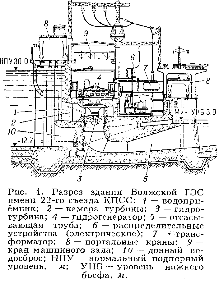 В состав сооружений русловой ГЭС, кроме плотины, входят здание ГЭС и водосбросные сооружения (рис. 4). Состав гидротехнических сооружений зависит от высоты напора и установленной мощности. У русловой ГЭС здание с размещенными в нём гидроагрегатами служит продолжением плотины и вместе с ней создаёт напорный фронт. При этом с одной стороны к зданию ГЭС примыкает верхний бьеф, а с другой — нижний бьеф. Подводящие спиральные камеры гидротурбин своими входными сечениями закладываются под уровнем верхнего бьефа, выходные же сечения отсасывающих труб погружены под уровнем нижнего бьефа. В соответствии с назначением гидроузла в его состав могут входить судоходные шлюзы или судоподъёмник, рыбопропускные сооружения, водозаборные сооружения для ирригации и водоснабжения. В русловых ГЭС иногда единственным сооружением, пропускающим воду, является здание ГЭС. В этих случаях полезно используемая вода последовательно проходит входное сечение с мусорозадер-живающими решётками, спиральную ка- меру, гидротурбину, отсасывающую трубу, а по спец. водоводам между соседними турбинными камерами производится сброс паводковых расходов реки. Для русловых ГЭС характерны напоры до 30—40 м к простейшим русловым ГЭС относятся также ранее строившиеся сельские ГЭС небольшой мощности. На крупных равнинных реках основное русло перекрывается земляной плотиной, к которой примыкает бетонная водосливная плотина и сооружается здание ГЭС. Такая компоновка типична для многих отечественных ГЭС на больших равнинных реках. Волжская ГЭС им. 22-го съезда КПСС— наиболее крупная среди станций руслового типа. При более высоких напорах оказывается нецелесообразным передавать на здание ГЭС гидростатичное давление воды. В этом случае применяется тип плотиной ГЭС, у которой напорный фронт на всём протяжении перекрывается плотиной, а здание ГЭС располагается за плотиной, примыкает к нижнему бьефу (рис. 5). В состав гидравлической трассы между верхним и нижним бьефом ГЭС такого типа входят глубинный водоприёмник с мусорозадерживающей решёткой, турбинный водовод, спиральная камера, гидротурбина, отсасывающая труба. В качестве дополнит, сооружений в состав узла могут входить судоходные сооружения и рыбоходы, а также дополнительные водосбросы Примером подобного типа станций на многоводной реке служит Братская ГЭС на реке Ангара. К началу Великой Отечеств, войны 1941—45 в СССР было введено в эксплуатацию 37 ГЭС общей мощностью более 1500 Мвт. Во время войны было приостановлено начатое строительство ряда ГЭС общей мощностью около 1000 Мвт (1 млн. квт). В 60-х гг. наметилась тенденция к снижению доли ГЭС в общем мировом производстве электроэнергии и всё большему использованию ГЭС для покрытия пиковых нагрузок. К 1970 всеми ГЭС мира производилось около 1000 млрд. квт-ч электроэнергии в год, причём начиная с 1960 доля ГЭС в мировом производстве снижалась в среднем за год примерно на 0,7% . Особенно быстро снижается доля ГЭС в общем производстве электроэнергии в ранее традиционно считавшихся “гидроэнергетическими” странах (Швейцария, Австрия, Финляндия, Япония, Канада, отчасти Франция), т. к. их экономический гидроэнергетический потенциал практически исчерпан. Несмотря на снижение доли ГЭС в общей выработке, абсолютные значения производства электроэнергии и мощности ГЭС непрерывно