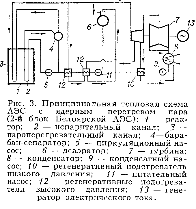 (рис. 3). В высокотемпературных графито-газовых реакторах возможно применение обычного газотурбинного цикла. Реактор в этом случае выполняет роль камеры сгорания. При работе реактора концентрация делящихся изотопов в ядерном топливе постепенно уменьшается, и топливо выгорает. Поэтому со временем их заменяют свежими. Ядерное горючее перезагружают с помощью механизмов и приспособлений с дистанционным управлением. Отработавшее топливо переносят в бассейн выдержки, а затем направляют на переработку. К реактору и обслуживающим его системам относятся: собственно реактор с биологической защитой, теплообменники, насосы или газодувные установки, осуществляющие циркуляцию теплоносителя; трубопроводы и арматура циркуляции контура; устройства для перезагрузки ядерного горючего; системы спец. вентиляции, аварийного расхолаживания и др. В зависимости от конструктивного исполнения реакторы имеют отличит, особенности: в корпусных реакторах топливо и замедлитель расположены внутри корпуса, несущего полное давление теплоносителя; в канальных реакторах топливо, охлаждаемые теплоносителем, устанавливаются в спец. трубах-каналах, пронизывающих замедлитель, заключённый в тонкостенный кожух. Такие реакторы применяются в России (Сибирская, Белоярская АЭС и др.), Для предохранения персонала АЭС от радиационного облучения реактор окружают биологической защитой, основным материалом для которой служат бетон, вода, серпантиновый песок. Оборудование реакторного контура должно быть полностью герметичным. Предусматривается система контроля мест возможной утечки теплоносителя, принимают меры, чтобы появление не плотностей и разрывов контура не приводило к радиоактивным выбросам и загрязнению помещений АЭС и окружающей местности. Оборудование реакторного контура обычно устанавливают в герметичных боксах, которые отделены от остальных помещений АЭС биологической защитой и при работе реактора не обслуживаются, Радиоактивный воздух и небольшое количество паров теплоносителя, обусловленное наличием протечек из контура, удаляют из необслуживаемых помещений АЭС спец. системой вентиляции, в которой для исключения возможности загрязнения атмосферы предусмотрены очистные фильтры и газгольдеры выдержки. За выполнением правил радиационной безопасности персоналом АЭС следит служба дозиметрического контроля. При авариях в системе охлаждения реактора для исключения перегрева и нарушения герметичности оболочек ТВЭЛов предусматривают быстрое (в течение несколько секунд) глушение ядерной реакции; аварийная система расхолаживания имеет автономные источники питания. Наличие биологической защиты, систем спец. вентиляции и аварийного расхолаживания и службы дозиметрического контроля позволяет полностью обезопасить обслуживающий персонал АЭС от вредных воздействий радиоактивного облучения. Оборудование машинного зала АЭС аналогично оборудованию машинного зала ТЭС. Отличит, особенность большинства АЭС — использование пара сравнительно низких параметров, насыщенного или слабо перегретого. При этом для исключения эрозионного повреждения лопаток последних ступеней турбины частицами влаги, содержащейся в пару, в турбине устанавливают сепарирующие устройства. Иногда необходимо применение выносных сепараторов и промежуточн