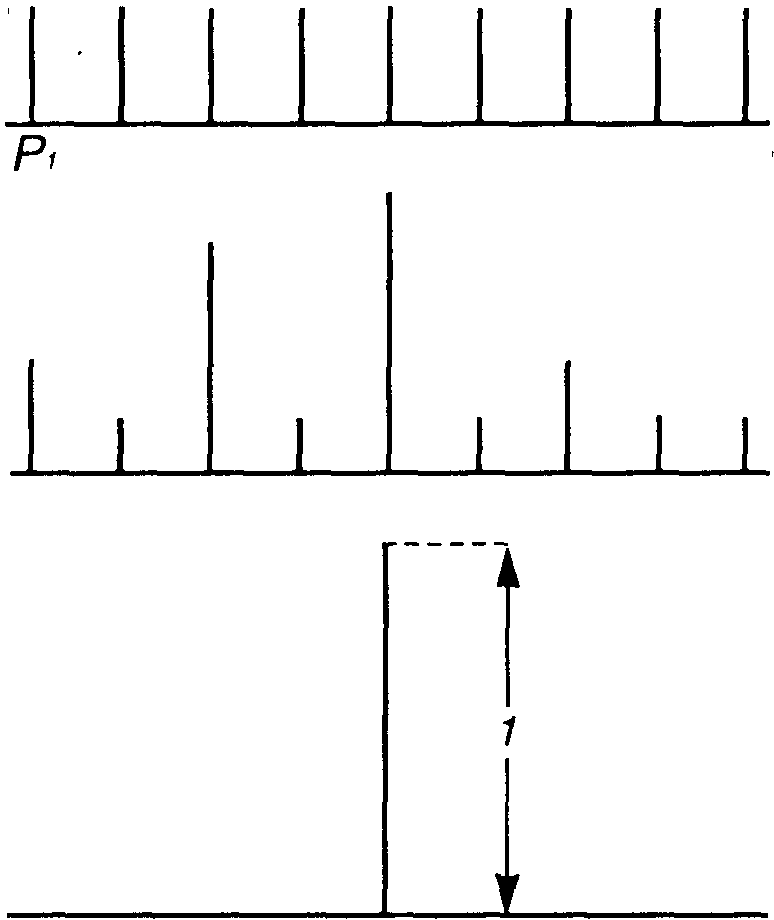 Смысл условия нормировки заключается в том, что сумма вероятностей выпадения всех 6-ти граней игральной кости равна вероятности выпадения любой грани, т.е. : Р 1 + Р 2 + … Р 6 = 1 / 6 + 1 / 6 + … + 1 / 6 = 1 6 раз В рассматриваемом нами процессе обучения, приводящем к дифференцировке значений вероятностей реакций P i , составляющих полную группу N, условие (3.8) свидетельствует о том, что увеличение вероятностей каких -то реакций может происходить только за счет уменьшения всех остальных вероятностей (чтобы сумма была по-прежнему равна 1, см. рис. 1, случай б ). В предельном случае одна из N вероятностей может возрасти до 1 , тогда все остальные вероятности станут равны 0 (рис. 1). В случае текста предельному случаю дифференцировки соответствует вероятность одной буквы (например, “е”), равная 1 . Вероятности всех остальных букв при этом равна нулю. Это значит, что текст вырождается в повторение одной буквы е е е е е ... Этот случай соответствует жесткой детерминации (незатухающий строго периодический процесс). Соответствующее жесткой детерминации распределение вероятностей, при котором некая вероятность Р к равна 1 , а все остальные - равны 0, в общем виде запишется как Рк=1 (3.9) Р 1 = Р 2 = . . .= Р к-1 = Р к+1 =. . .= 0 (3.10)