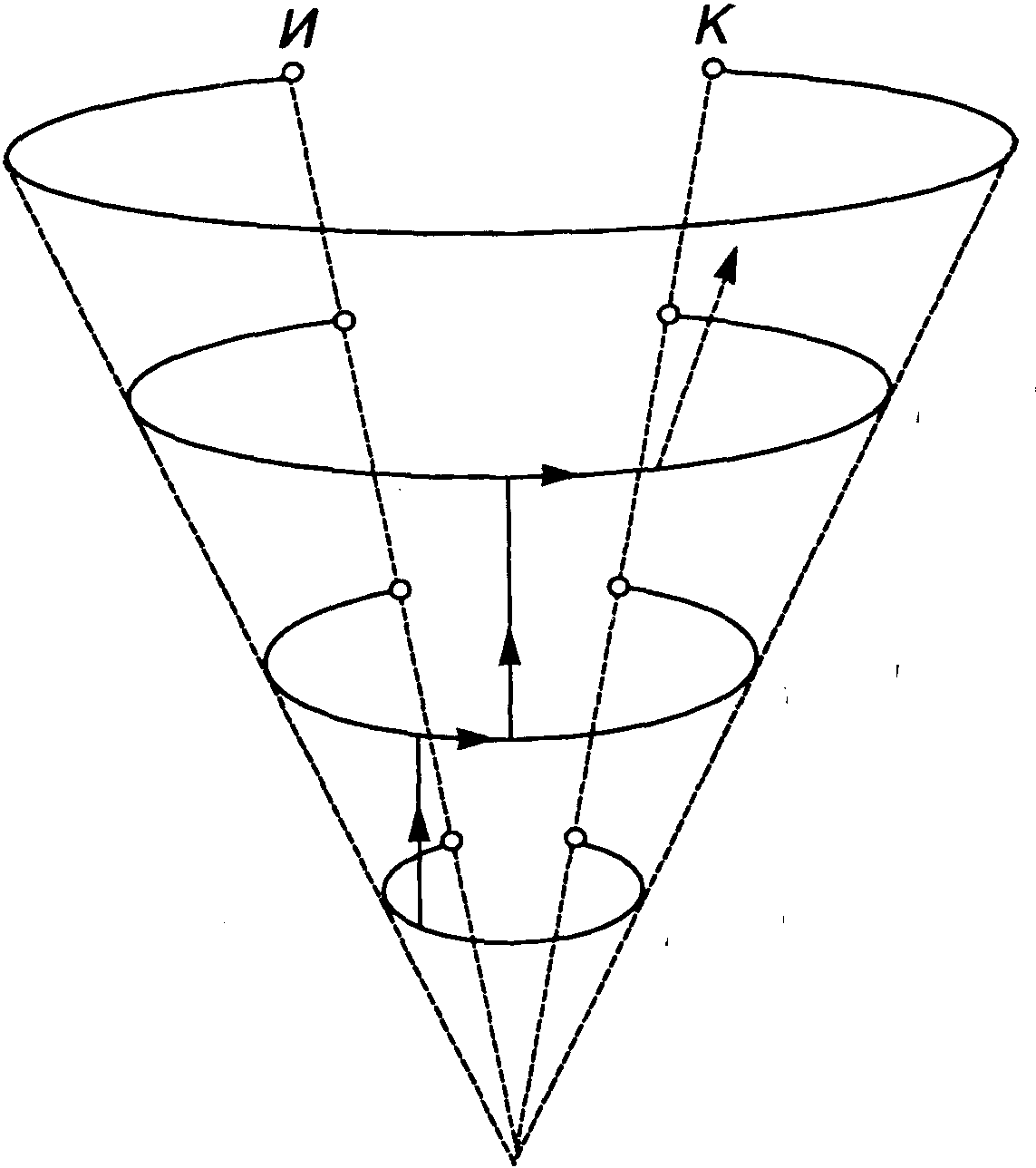 На рис.3 изображена расширяющаяяся иерархическая спираль, которая может служить моделью формирования иерархических упорядоченных структур. Пусть нижний уровень этой спирали (п = 0) соответствует начальному алфавиту, состоящему из N 0 различных элементов (букв, атомов, нуклеотидов и др.).