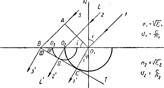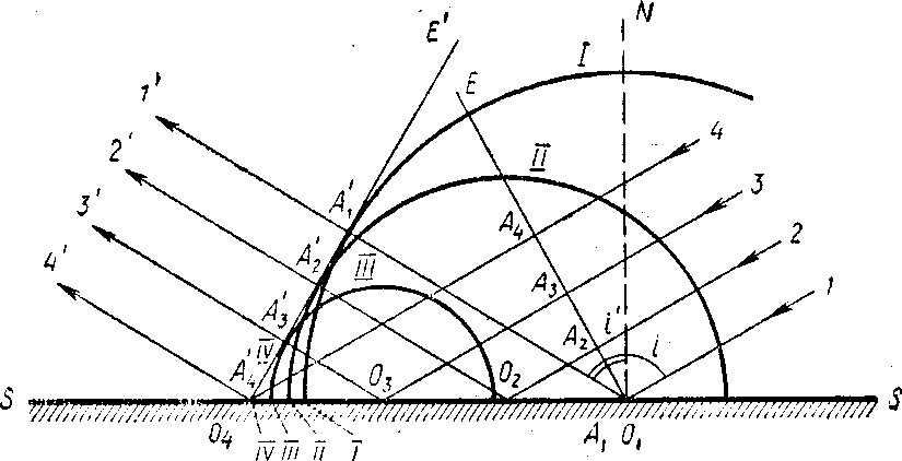 На рисунке 1 изображена схема, объясняющая отражение плоской световой волны Е от плоской границы раздела SS двух оптически разнородных сред. Цифрами /, 2, 3, 4, ... обозначены параллельные лучи, вдоль которых распространяется энергия волны, один из плоских фронтов которой изображен прямой (следом) Е, нормальной к лучам. Расстояния между лучами /, 2, 3, 4, ... выбраны равными между собой. Световые колебания, бегущие вдоль луча /, возбуждают в точке О г элементарную сферическую волну /, которая за время At пробегает путь 0 1 А — сАt. Аналогичные световые колебания возбуждают в точках 0 2 , 0 3 , 0 4 , ... элементарные сферические волны //, ///, IV, ... . За время Аt колебание, идущее вдоль луча 2, пробежит путь ОA 2 , и после встречи с поверхностью SS сферическая волна // пройдет расстояние О2A2, причем 0 2 А' 2 + 0 2 A 2 = О1А1 . Точно так же будем иметь: 0 3 А' 3 + 0 3 A 3 = О 1 А 1 и т. д. Вследствие этого элементарные сферические волны /, //, ///, IV, ... будут иметь общую касательную поверхность Е', которая касается элементарных волн /, //, ///, IV, ... в точках A1, А2, А' 3 , A 4 ', ... . Эта общая касательная поверхность и будет представлять поверхность отраженной световой волны. Из геометрических соотношений нетрудно показать, что угол падения I равен углу отражения I ', луч падающий и отраженный находятся в одной плоскости с перпендикуляром, опущенным на поверхность раздела в точке падения. Если отражение происходит от кривых поверхностей, то закон отражения в той форме, в которой он здесь сформулирован, применяется к бесконечно малым участкам поверхности, которые могут приниматься с очень большой степенью приближения за плоские. Практическое применение этого закона будет сделано в приложении к сферическим зеркалам. При отражении света на границах раздела двух сред всегда имеет место неполное отражение, так как какое-то количество света проходит в среду, от границы с которой и происходит отражение. Если эта среда слабо поглощает, то частично прошедший свет распространяется в ней на большие расстояния. В случае поглощающей среды проникший в нее свет быстро поглощается, а его энергия обычно происходит по внутреннюю энергию среды. Возможны и другие превращении световой энергии, проникшей во вторую среду. Введем обозначения: R — коэффициент отражения; А — коэффициент, определяющий поглощение света средой после его проникновения в псе (среда полностью поглощает прошедшее в нее излучение), тогда