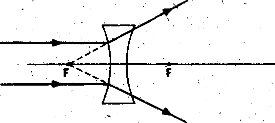 рис4 оптический центр линзы, называются побочными оптическими осями. Расстояние между оптическим центром линзы и фокусом называется фокусным расстоянием. Очевидно, что фокусное расстояние является величиной положительной. Лучи, параллельные побочной оптической оси, собираются в фокальной плоскости, в точке ее пересечения побочной оптической осью (точка М), У рассеивающей линзы фокус мнимый. Параллельный пучок лучей, падающих на линзу, рассеивается. Пересекаются продолжения этих лучей (рис. 4). Все изложенное относится к идеальным оптическим системам и справедливо в достаточно узком параксиальном пучке лучей, т. е . лучей, образующих с главной оптической осью малый угол. Величина, обратная фокусному расстоянию (выраженному в метрах), называется оптической силой линзы: D=1/F (дп)