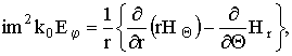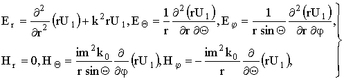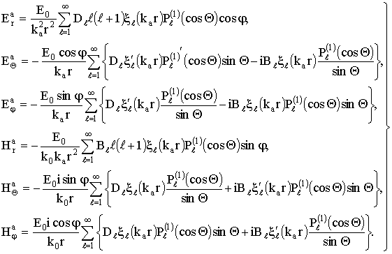 Падающее поле возбуждает в шаре внутреннее поле, а во внешнем пространстве – дифрагированное поле, причем все эти поля должны иметь оду и ту же временную зависимость, т.е. частоту. Произвольное электромагнитное поле будем представлять как суперпозицию двух типов колебаний. Первый тип назовем электрическими колебаниями и будем считать, что у этих колебаний радиальная составляющая магнитного поля во всех точках равна нулю: