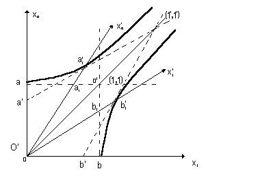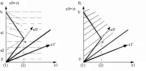 Но преобразования (p) тождественны преобразованиям перехода от декартовых координат к косоугольным. При этих преобразованиях времениподобные векторы, т.е. векторы, направленные из начала отсчета в точки, лежащие выше линии OO', в любой системе координат также останутся времениподобными, т.к. концы векторов лежат на гиперболах. Следовательно, и пространственноподобные векторы во всех системах координат останутся пространственноподобными.