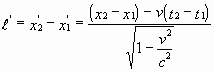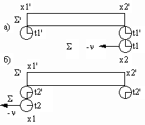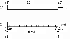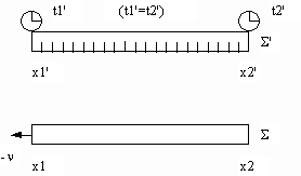 Сокращение движущихся масштабов. Если длина неподвижного масштаба может быть измерена путем прикладывания к нему эталонных масштабов, без использования каких-либо часов, то длину движущегося масштаба невозможно измерить из неподвижной системы отсчета без использования часов или сигналов, отмечающих одновременность прохождения концов измеряемого масштаба относительно точек эталона. Таким образом, под длиной движущегося масштаба надо понимать расстояние между его концами, измеренное при помощи неподвижного эталона в один и тот же момент времени для каждого конца. Одновременность измерения положений концов является существенно необходимым условием опыта. Легко видеть, что нарушение этого условия может привести к тому, что измеренная длина может оказаться любой, в том числе отрицательной или равной нулю.