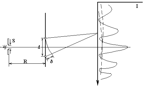 Рис. 2. Схема опыта Юнга. Справа сплошной линией представлена зависимость интенсивности на экране от координаты, нормальной щелям; пунктиром показана освещённость экрана при поочерёдном закрывании щелей. Ограничения, связанные с когерентностью, могут быть понятны из рассмотрения наложения и. к. от отдельных точек реального источника. При слишком больших размерах источника суммарная и. к. оказывается смазанной. Виды интерференции света. Различают двухлучевую и многолучевую И. с. В первом случае свет в каждую точку и. к. приходит от общего источника по двум путям, как на рис. 2, при этом распределение интенсивности на и. к. явл. гармонич. ф-цией (~cos 2 2pd/l). Многолучевая И. с. возникает при наложении мн. когерентных волн, получаемых делением исходного волн. фронта с помощью многократных отражений (напр., в интерферометре Фабри - Перо) или дифракцией на многоэлементных периодич. структурах. При многолучевой И. с. интенсивность и. к. явл. периодической, но не гармонич. ф-цией d (рис. 3). Резкая зависимость интенсивности и. к. от длины волн при многолучевой И. с. широко используется в спектр. приборах.