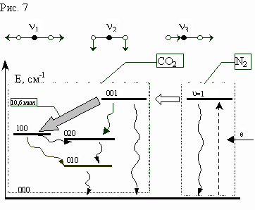 В лазере на основе СО 2 используется четырёхуровневая система получения инверсной населённости между колебательными уровнями молекул. Молекула СО 2 состоит из атома углерода и двух симметрично расположенных атомов кислорода, т.е. имеет линейную структуру О-С-О. Как видно из схемы на рис. 7 атомы кислорода могут совершать симметричные (мода n 1 ОО) и несимметричные (асимметричные) (мода n 3 ОО), а также поперечные этому направлению так называемые деформационные колебания (мода n 2 L OO) - из-за наличия двух взаимно перпендикулярных направлений этот тип колебаний является дважды вырожденным. Употребляемые для описания состояния колебательно-возбуждённой молекулы квантовые числа n 1 , n 2 L и n 3 характеризуют число квантов, соответствующих колебанию данного типа, L указывает поляризацию деформированного колебания. Лазерный квант излучается при переходе из состояния 001 в 100 (цифры обозначают колебательные квантовые числа в модах n 1 , n 2 L и n 3 соответственно). Возможен также переход 001 ® 020 с длиной волны l =9.4 мкм, но он обычно гораздо слабее. Для получения оптимальных условий в рабочую смесь СО 2 - лазера помимо углекислого газа добавляют азот и гелий.
